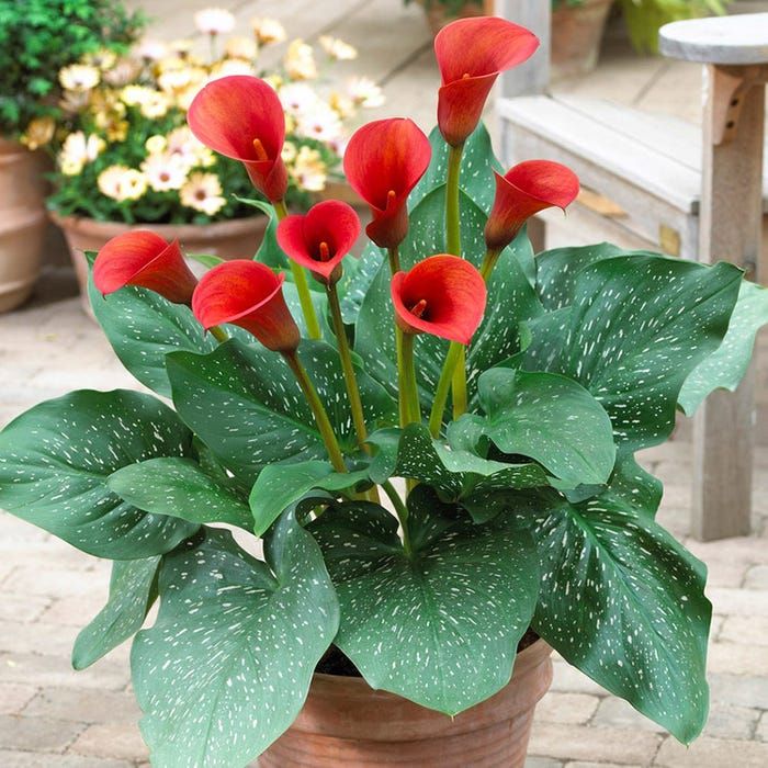 Калла Ред Алерт (Red Alert) — Сорт садовой каллы с крупными цветками насыщенного ярко-алого цвета. Листья украшены белыми пятнышками. Вырастить каллы в саду несложно, необходимо лишь следовать агротехнике. В середине апреля клубень можно высадить в небольшой горшок. У некоторых сортов калл очень плохо выражена точка роста и довольно трудно различить, где же находится верх клубня. Цветение июнь-сентябрь (в зависимости от срока высадки клубней). Количество цветков зависит от размера клубня, может быть от 3 до 10. ПОСАДКА М УХОД. Рано весной в горшки для комнатной культуры, в открытый грунт — после того, как минует угроза заморозков. Клубни  сажают на глубину 5-10 см и хорошо проливают почву, поскольку каллы любят влагу. Для посадки каллы подойдет притененный участок. Идеальный вариант, место под негустыми кронами деревьев. Чтобы было достаточно светло, а солнечные лучи не обжигали листьев. Очень эффектно смотрятся каллы, рядом с искусственным водоемом. Отлично цветет и растет только в тепле, где температура не ниже 18°C, самая оптимальная температура 22-23°C. Не переносит сквозняков. Цветоносы этого растения высокие, которые идут прямо от низа растения. На открытом воздухе это прекрасное растение цветет 1 месяц, а в закрытом помещении — 14 дней. Осенью растения сбрасывают листья. На зиму клубни каллы нужно выкопать и хранить в непромерзаемом помещении.